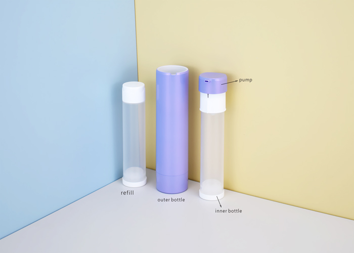 This well-designed rotatable & refillable airless cosmetic bottle is double-walled and features a refillable inner bottle to reduce waste of plastic, a great solution for cream and serum.